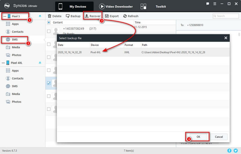 Step 3 Make sure Pixel 5 is well connected to Syncios Manager and jump to 'SMS' tab under the Pixel 5 device. The same you will enter the SMS management but this time directly click on 'Recover' button. It will then show you previous SMS backup for option. Choose the backup files and tap 'OK' to let Syncios sync the backup to Pixel 5.