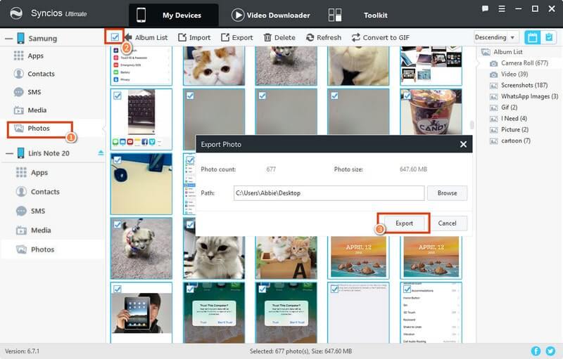 Syncios Android Manager offers 2 options for uses to selectively backup the files or backup all the files in one-click. Here we show you how to back up specific items (Photos, Contacts, Music, Video, Apps, SMS) on old Samsung phone and how to retrieve the backup to Samsung Galaxy Note 20 at any time. If you want a one-click backup of Samsung phone to PC , view the steps in this article.